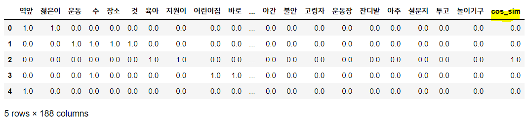 all_word 데이터 프레임에서 2번째 문장과의 코사인 유사도를 계산하고, 이를 새로운 열 'cos_sim'에 넣겠습니다.