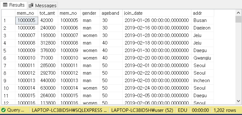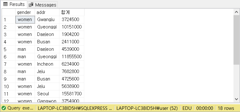 | Q. 2번 문제에서 짠 쿼리를 바탕으로, [gender]와 [addr] 컬럼별 [tot_amt] 합계를 구하여라. (단, SUM(tot_amt)의 열 이름은 '합계'로 하고, gender와 addr 컬럼은 [MEMBER] 테이블에만 있다.)