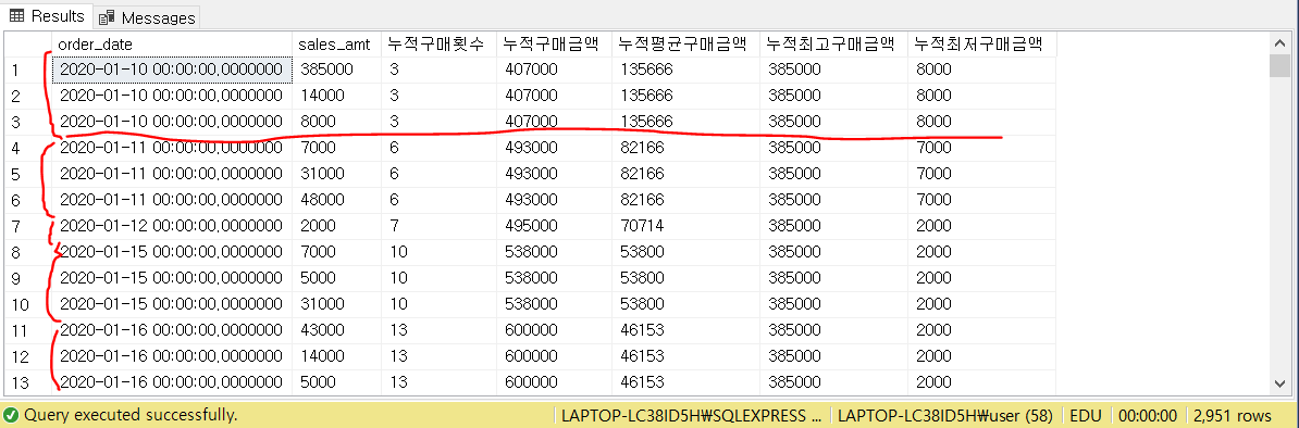 그 외에 누적 구매금액(sales_amt의 합계) / 누적 평균구매금액(sales_amt의 평균) / 누적 최고구매금액(3건 중에서 가장 큰 sales_amt) / 누적 최저구매금액(3건 중에서 가장 작은 slaes_amt) 가 뽑힌 것을 확인할 수 있습니다.