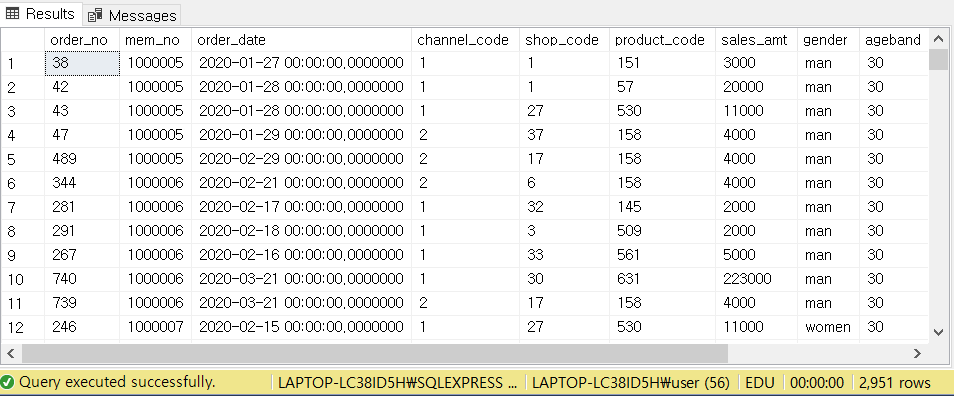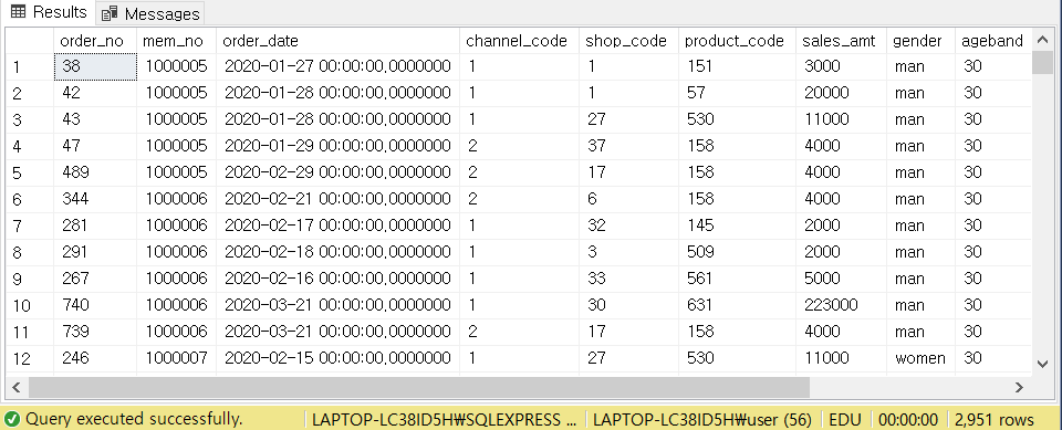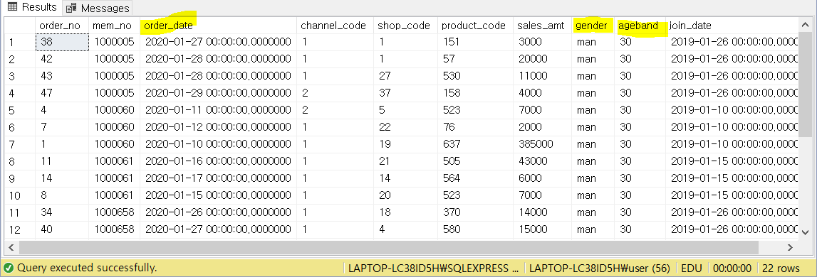 [SY_PRO] 테이블에서, 1월달에 구매한 30대 남성의 주문내역만 보고자 한다면 다음을 입력한다.