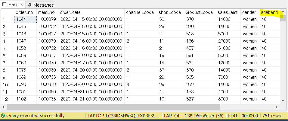 여기에선 앞서 JOIN으로 만든 테이블을 그대로 사용하고, 특정 연령대(ageband) 입력 시 이에 해당하는 값만 뽑히도록 프로시저를 만들어보자.
