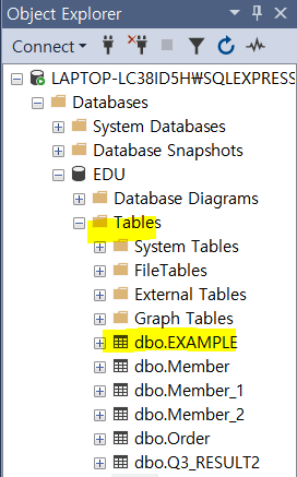 위와 같이 FROM절 바로 앞에 INTO 명령어를 사용하면 위처럼 Tables에 [EXAMPLE] 테이블이 생성된다.