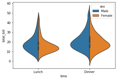 예를 들어 Lunch의 경우, 남성의 total_bill보다 여성의 total_bill이 더 중위수에 몰려 있는 분포임을 알 수 있다(그쪽으로 볼록 튀어나와 있으므로)