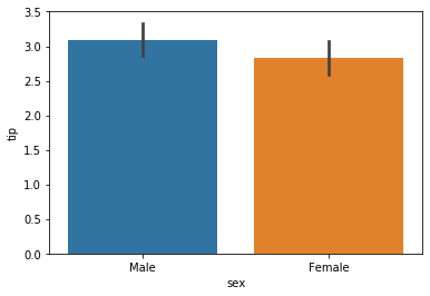 예를 들어, 성별 팁(tip)의 평균치가 어떻게 되는지 궁금하다고 할 때 막대그래프로 표현하면 다음과 같다.