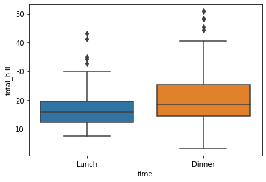 분포를 확인해보면, Lunch일 때와 Dinner일 때 total_bill(지불금액)의 중위값은 Dinner가 좀 더 높으며,