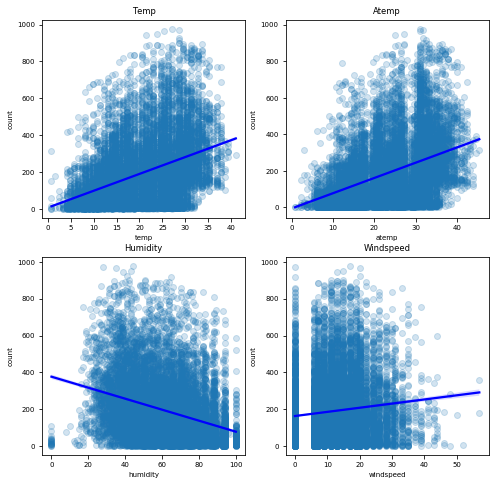 axs4 = sns.regplot('windspeed', 'count', data = train, ax = ax4, scatter_kws = {'alpha':0.2}, line_kws={'color':'blue'})