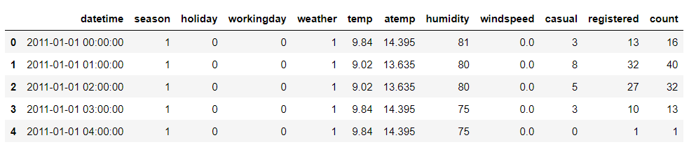 나머지 데이터셋은 temp(온도), atemp(체감온도), humidity(습도), windspeed(풍향), season(계절, 1~4 값), holiday(공휴일), workingday(평일), weather(날씨, 1~4 값), datetime(날짜 및 시간)을 의미하고 있다.