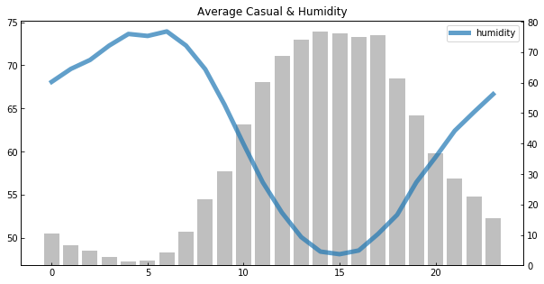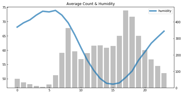 시간대별로 습도와 대여량 간 추이를 보면, 반비례 관계가 잘 드러나는 것을 확인할 수 있다.