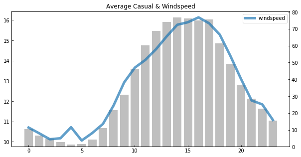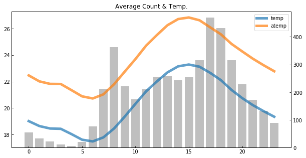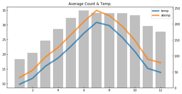 왼쪽 축은 평균 온도, 오른쪽 축은 평균 대여량(count)이다. 그래서 회색 바(bar)는 대여량이며, 선 그래프는 온도(파란색: 온도, 오렌지색: 체감온도)를 나타낸다.