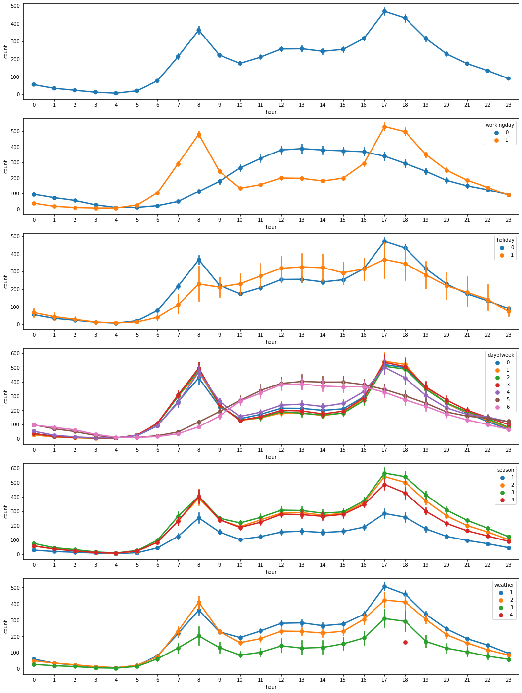 시간대로 쪼개어 살펴보면 경향이 더 확실할 것 같아, 시간대별로(hour별) 대여건을 나누어 살펴보았다.