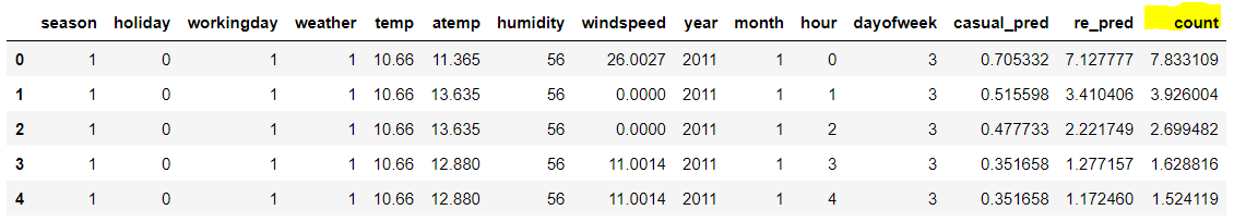 최종 결과는 예측 casual + 예측 registered를 더한 값이다!