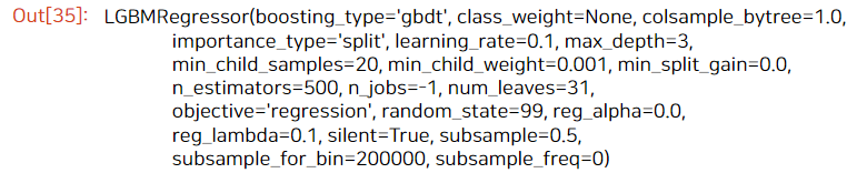 lgbm2 = LGBMRegressor(n_estimators = 500, objective = 'regression',learning_rate = 0.1, max_depth = 3, reg_lambda = 0.1, subsample = 0.5, random_state = 99)