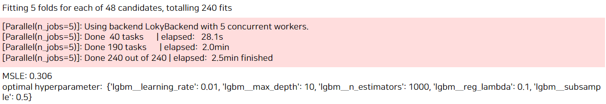 결과는 0.306으로 가장 좋은 성능이었다. LGBM은 가볍기 때문에 약 3분 정도 걸려 그리드서치가 완료되었다.