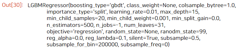 LGBM도 좀 더 성능향상을 위해 하이퍼 파라미터 튜닝을 했다. 이 모델도 파라미터가 아주 많기 때문에 어떤 것을 선택할지 주의가 필요하다. 파라미터는 여기서 확인할 수 있다.