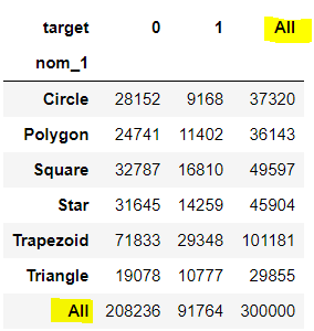 여기서 새로운 'All' 컬럼이 생겼는데, 이는 target의 값을 나누지 않고 nom_1 고유값들의 비율을 나타낸 것이다.