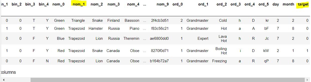 데이터프레임 df에는 많은 컬럼들이 있는데, 여기서 활용할 컬럼은 nom_1과 target이라는 두 범주형 데이터이다.