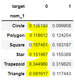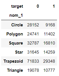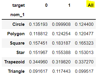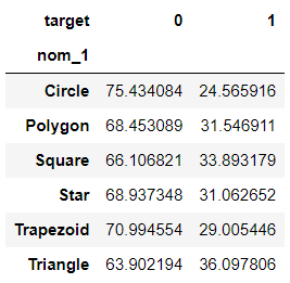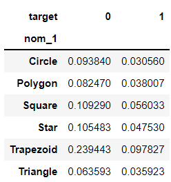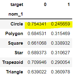 이렇게 되면 'nom_1'이 Circle일 때 target이 1인 비율은 약 25%구나! 라는 것을 알 수 있다.