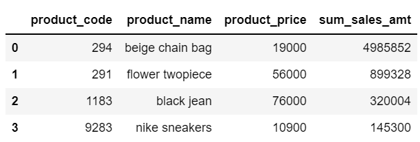 위 코드를 실행하면 쿼리 결과가 파이썬 상에 데이터프레임으로 출력될 것입니다.