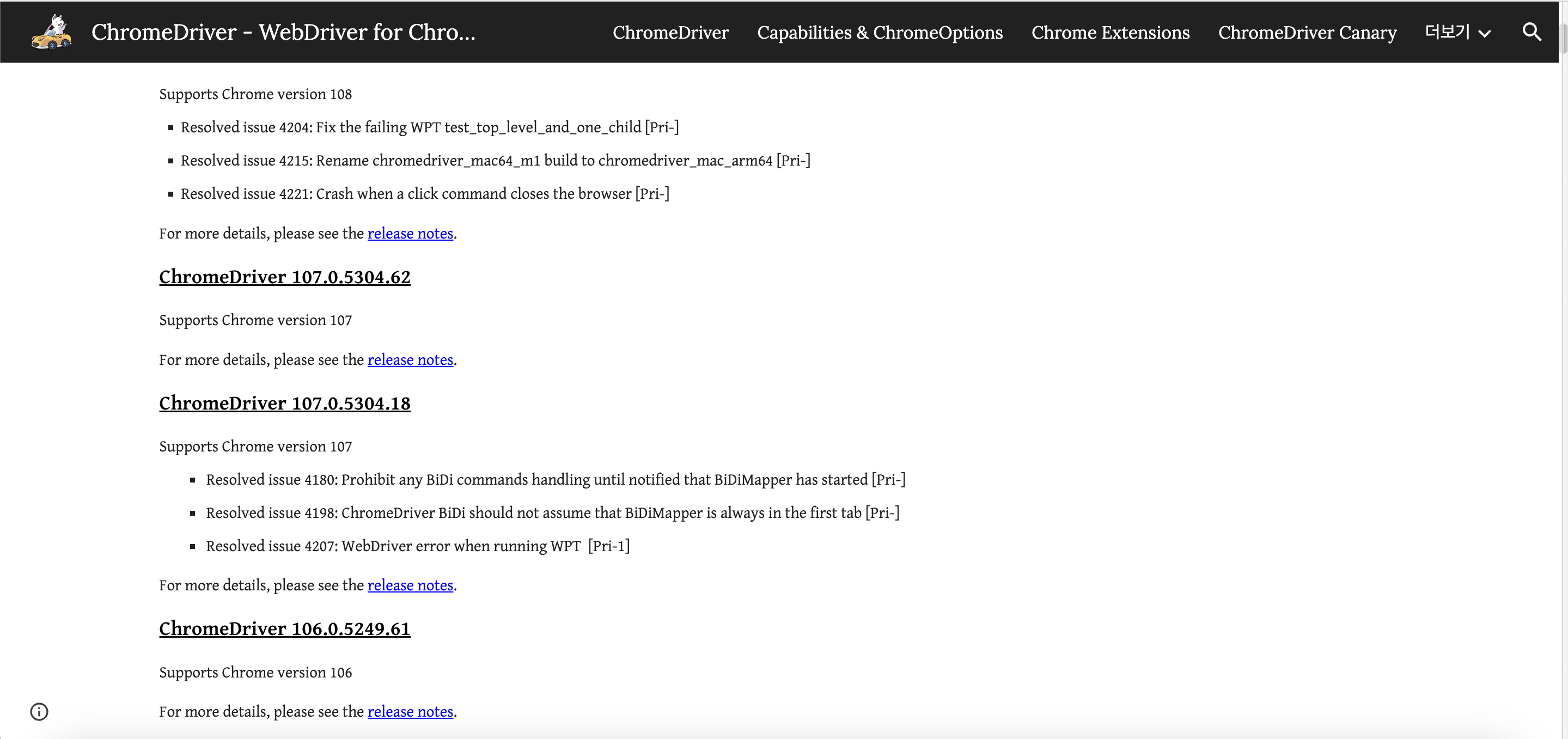그래서 나는 크롬드라이버의 107.0.5304.62를 설치해 주었다.