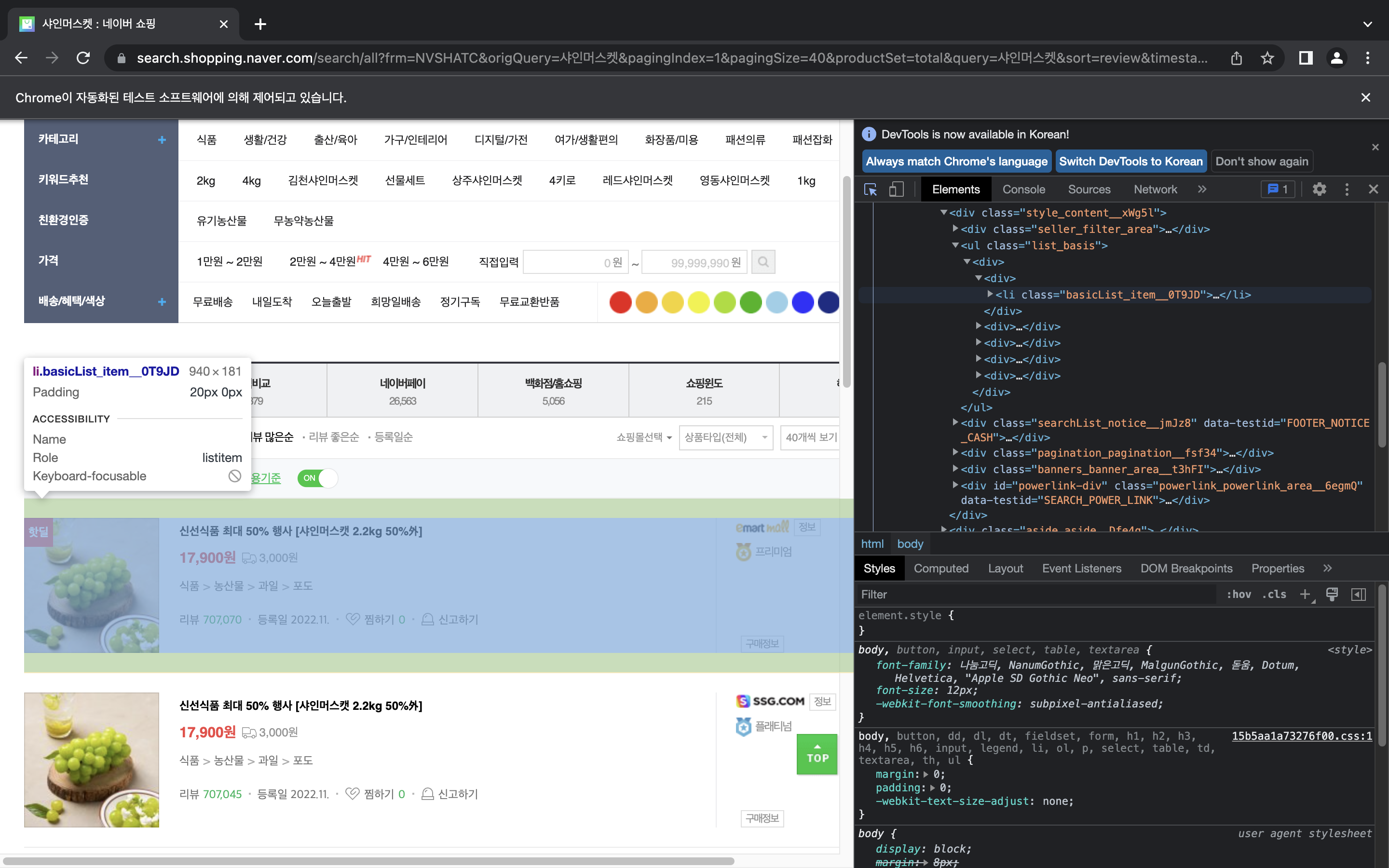 보시다시피 전체 상품정보는 "basicList_item__0T9JD" 라는 클래스(class)로 되어 있으며, 이 안에 상품의 제목, 가격, 등록일, 판매자 등의 정보가 들어있음을 확인할 수 있다. (꼭 첫번째 상품만 그런 게 아니라, 모든 상품에 대해 같은 클래스값을 가진다! 한번 눌러서 직접 확인해보자.)