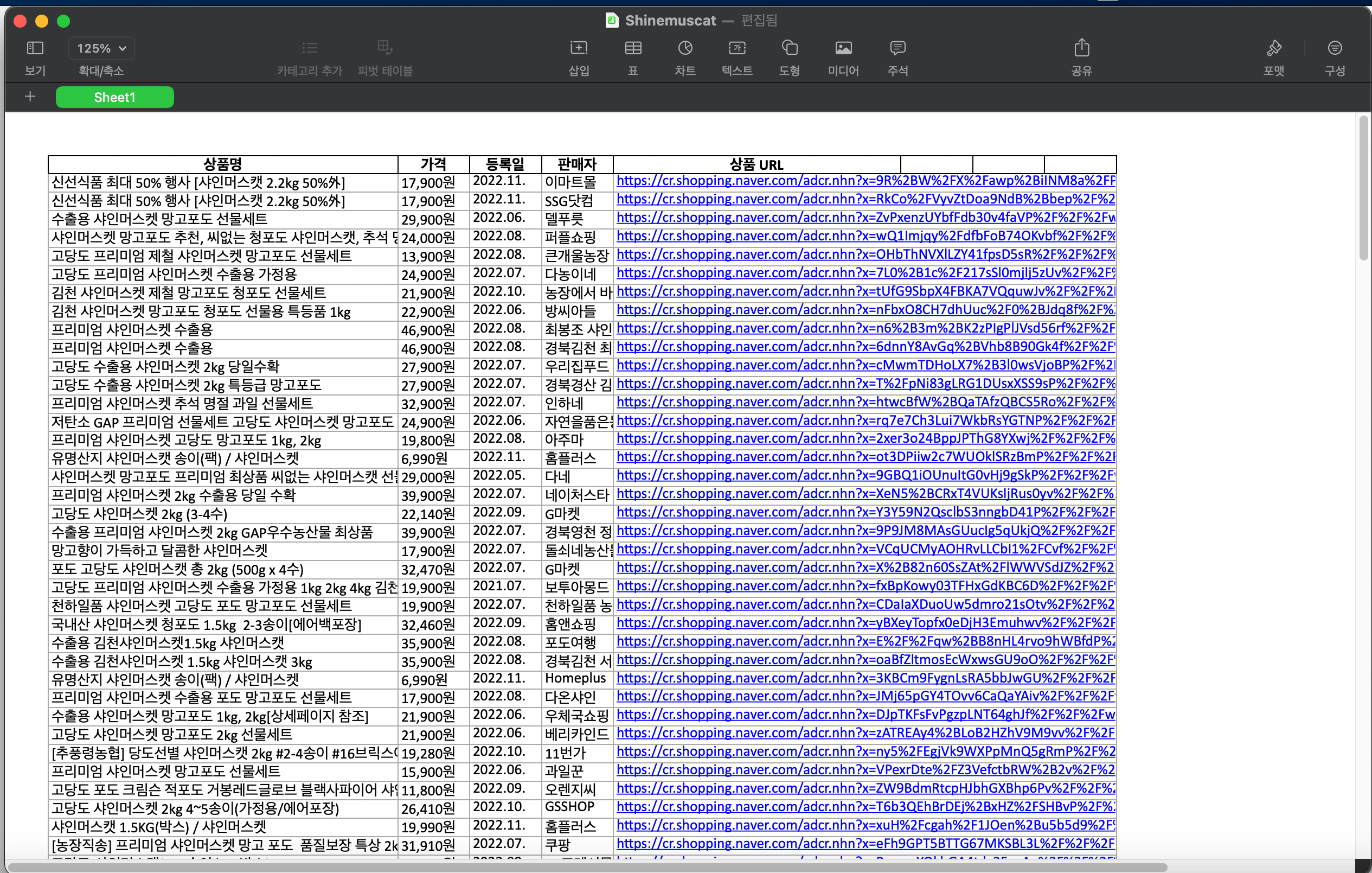 네이버 쇼핑 페이지에 '샤인머스캣'을 치고, "리뷰 많은순"으로 정렬해서 나온 값을 뽑았다.