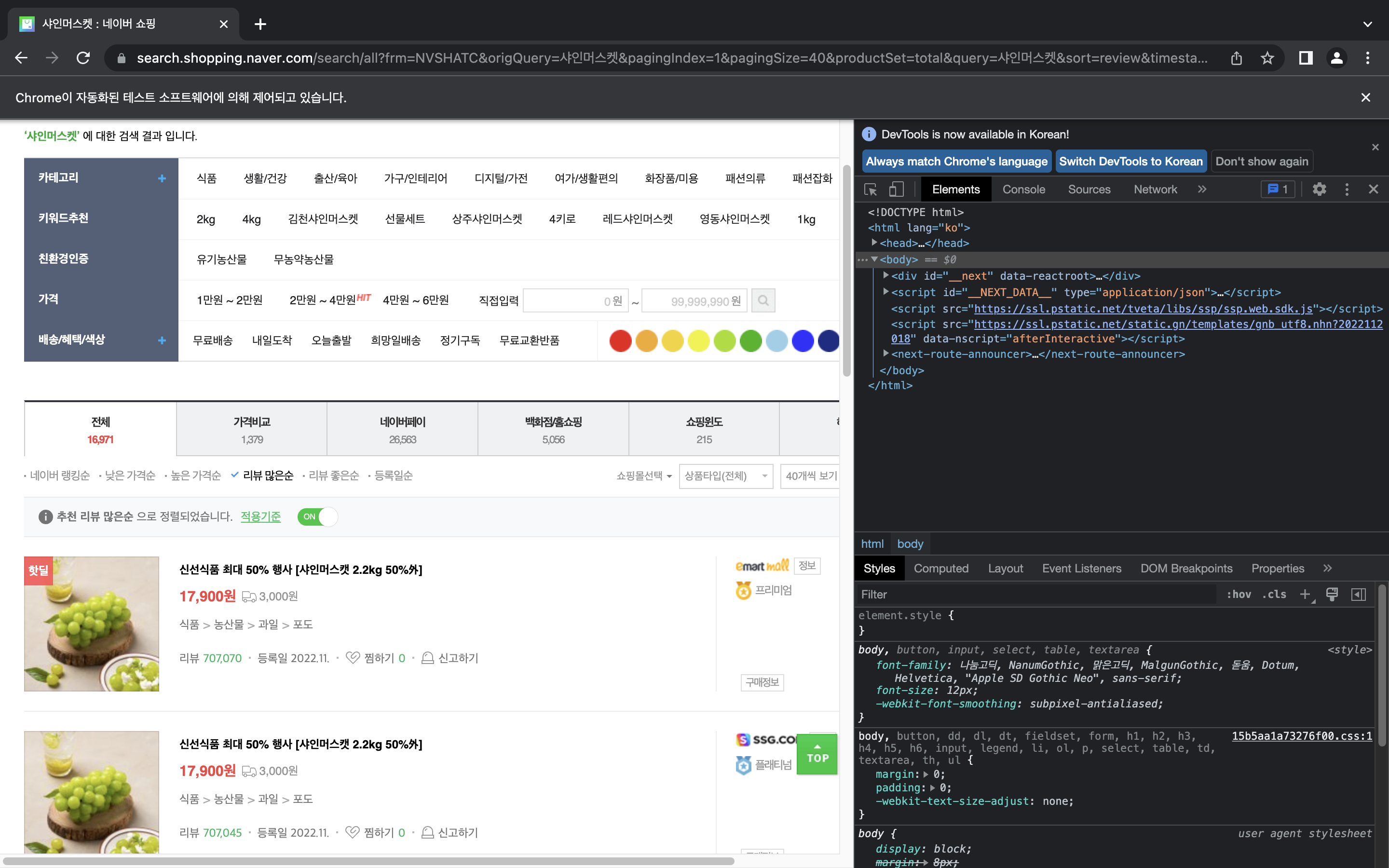 결과물은 '샤인머스캣'을 검색했을 때의 1, 2페이지에 해당하는 검색 결과(정렬 기준은 리뷰 많은 순서)를 뽑아 엑셀로 출력하는 것이다.