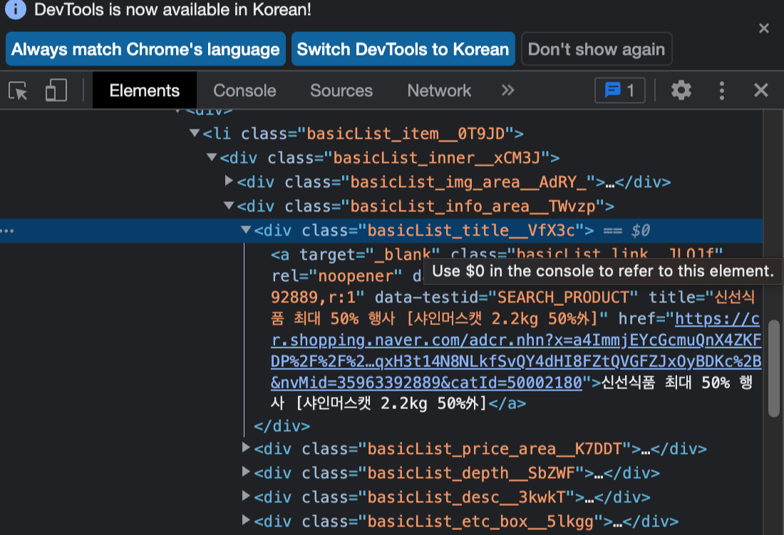위 사진을 보면 이 정보는 "basicList_title__VfX3c" 클래스 안에 들어있는 것을 확인할 수 있으며, title을 확인하면 "신선식품 최대 50% 행사" 라고 상품제목과 똑같은 값이 들어있는 것을 확인 가능하다.