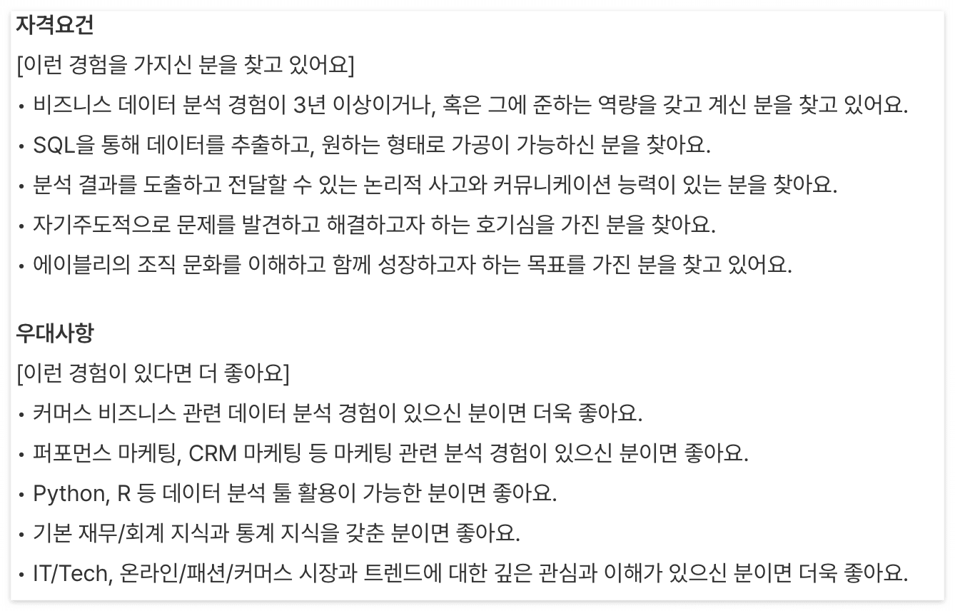 참고로, 채용 공고를 보면 지원자격에 '자격요건(필수 역량)'과 '우대사항'이 있어요.