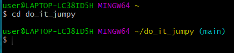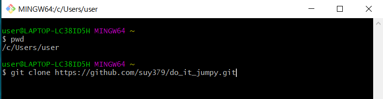 자, Git Bash는 지금 어디에 있을까요? 좀전에 pwd에서 알아봤듯 C:\Users\user 폴더에 있습니다. 하지만 여러분은 여러분의 레파지토리인 'do_it_jumpy'에 코드를 업로드하고자 하니, 당연히 위치를 바꿔주어야 합니다. 'do_it_jumpy'는 C:\Users\user 내에 있습니다. 그러므로 cd 명령어를 통해 이동합니다.
