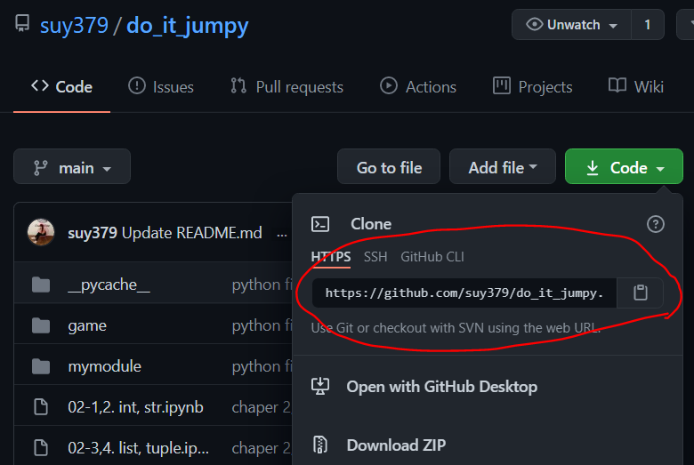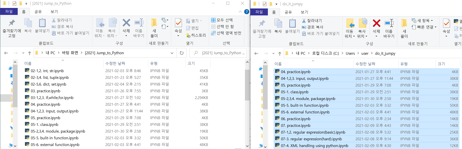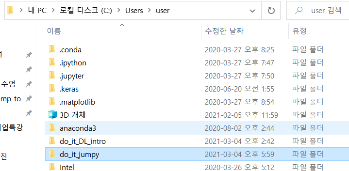 이제 업로드할 코드 파일들을 이곳에 옮겨 줍니다. 제가 갖고 있는 코드들은 Desktop\[2021] Jump_to_Python 이라는 폴더에 모두 저장되어 있었습니다. 이를 복사하여 C:\Users\user\do_it_jumpy 폴더 내에 저장합니다.