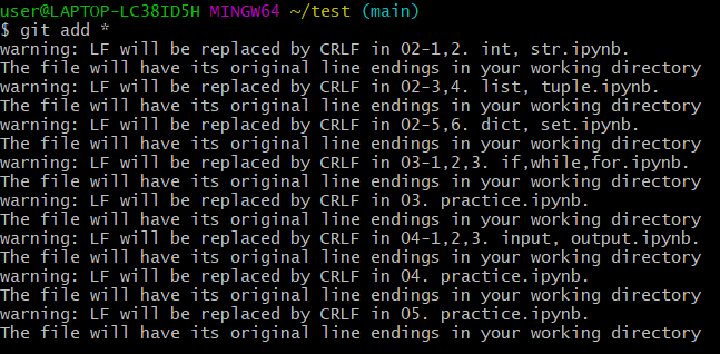 코드를 업로드하기 위한 첫번째 절차는 git add입니다. git add는 push할 파일명을 뒤에 써주어야 하는데, 저의 경우에는 한 번에 여러 개의 파일을 업로드하기 위해 * 문자를 사용하였습니다. 이를 이용하면 붉은 글씨로 나왔던 파일들이 모두다 add됩니다.