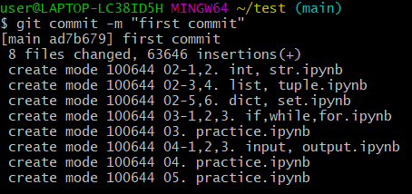 다음으로는 git commit입니다. -m "메세지"의 메세지는 쓰고 싶은 말을 쓰면 되며, 이는 나중에 깃허브에 업로드될 코드파일명 옆에 한줄로 Description으로 입력됩니다. 쓰고 싶지 않다면 안 써도 됩니다.