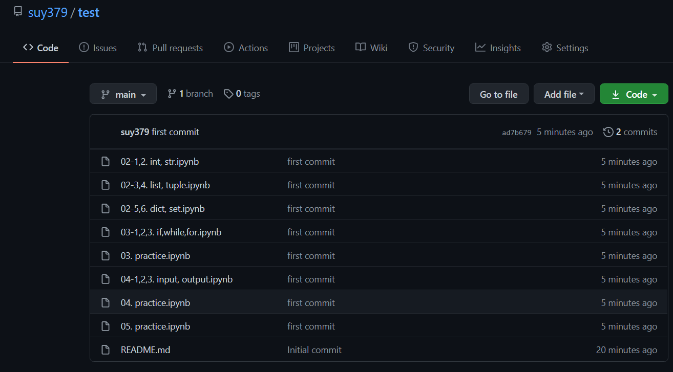 제가 한 화면과 똑같이 출력되셨다면 여러분의 깃허브 레파지토리에 들어가 새로고침을 해보세요. 이렇게 코드들이 올라와 있을 겁니다. 또한 파일명 옆에 description으로 'first commit'이라 친 것은 아까 git commit을 할 때 입력된 메세지입니다.