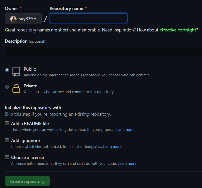 Public과 Private 중 레파지토리의 옵션을 선택할 수 있는데, Public은 모든 사람에게 공개되어 주소만 있으면 들어갈 수 있는 것이며 Private은 비공개로 만드는 것입니다.