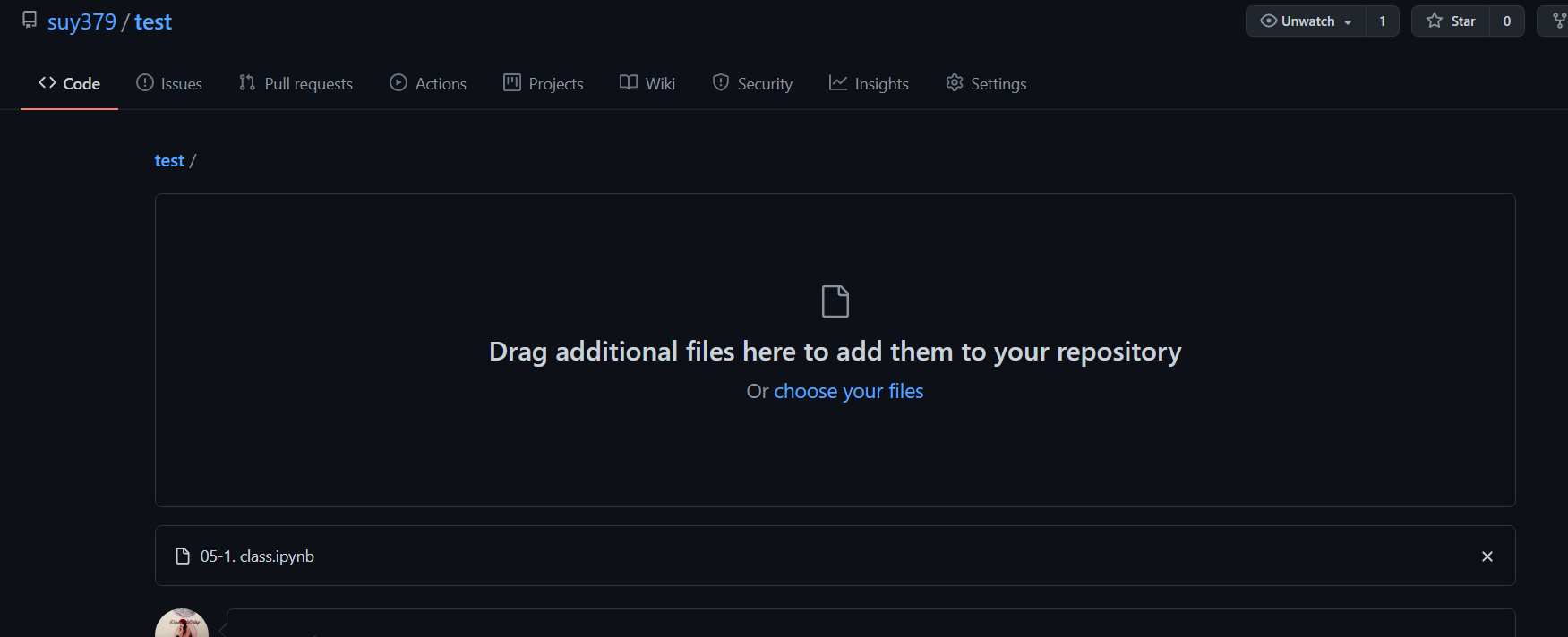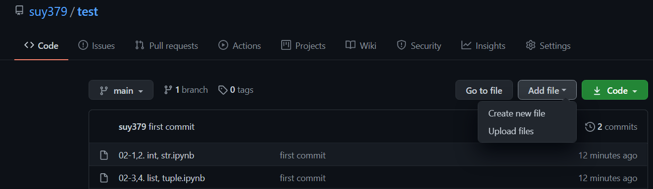 바로 요렇게 여러분의 레파지토리의 Add file-Upload files를 통해 올리는 방법이죠.