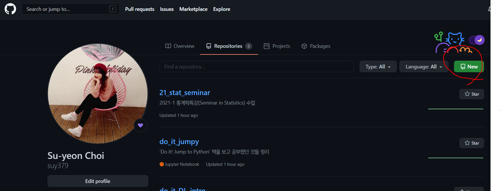 계정에 로그인한 뒤 여러분의 코드를 입력할 레파지토리를 만드는데, 사진의 빨간색 동그라미 친 부분 - New를 클릭하면 새로운 레파지토리를 개설할 수 있습니다.
