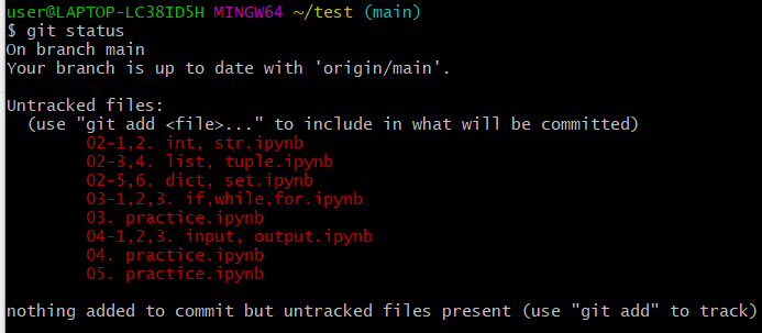 git push를 하기에 앞서 우리는 git add - commit - push의 과정을 거쳐야 합니다. 그리고 이 과정들 사이사이마다 사용할 수 있는 명령어가 git status입니다. 이름 그대로 이는 현재 폴더의 상태를 알려줍니다.