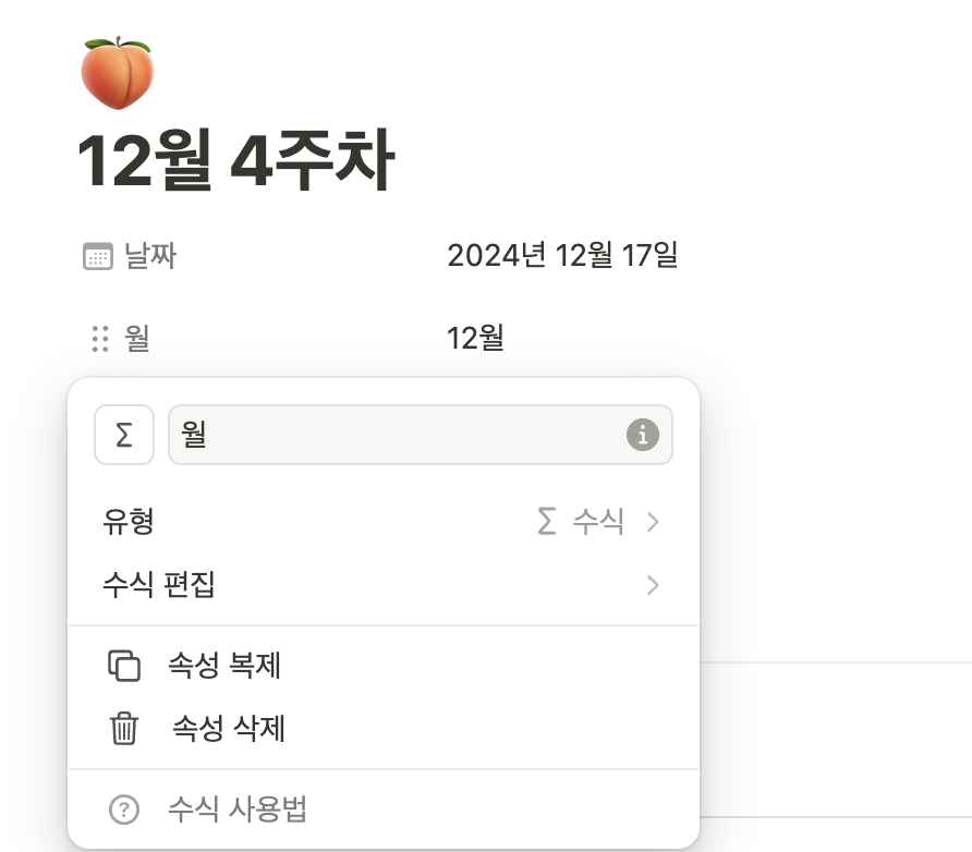 저는 이 페이지가 몇월 몇주차에 만든 건지를 알기 위해서 이름에 "N월 M주차" 라고 들어가도록 만들고 싶어서, '이름' 속성 수식에 다음을 입력했습니다.