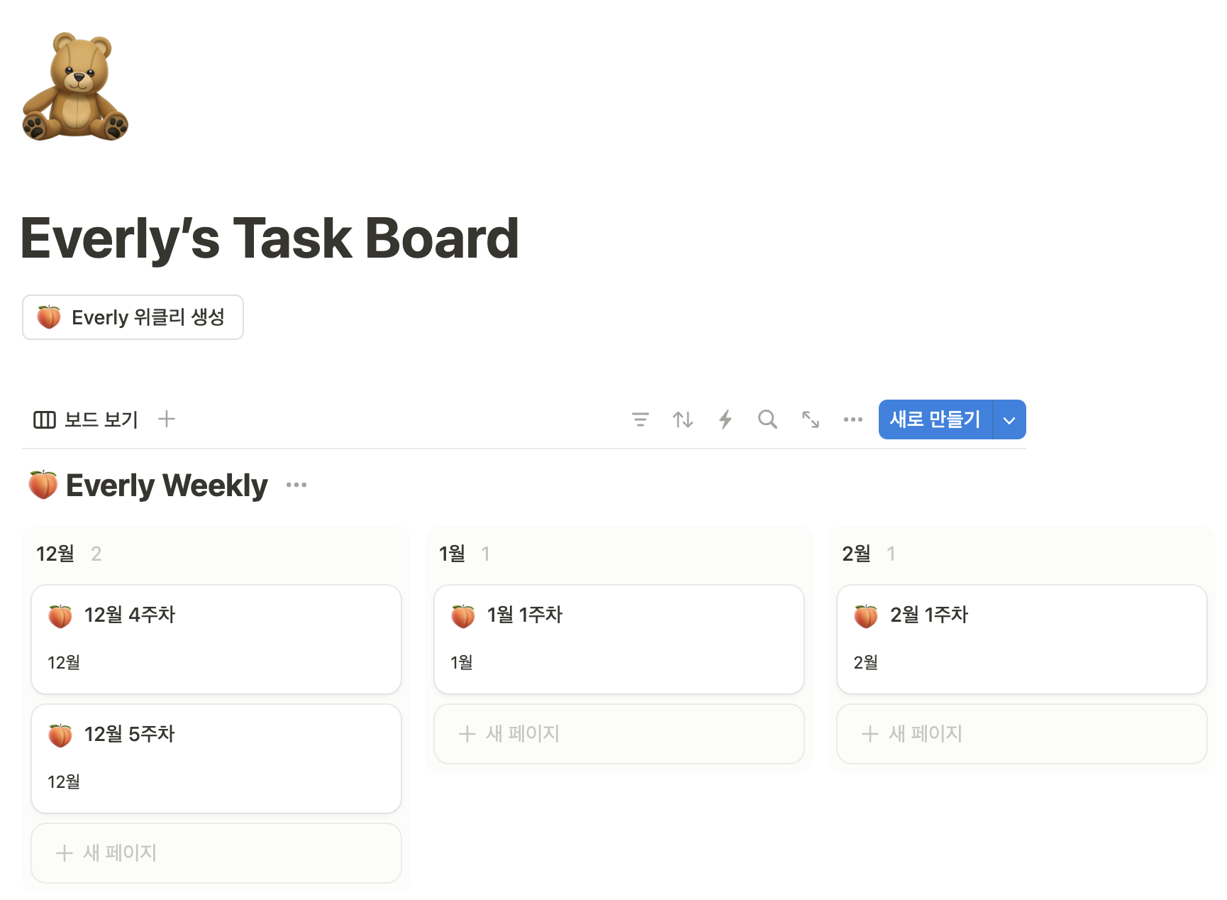 저의 경우는 [🍑Everly Weekly] 라는 데이터베이스를 만들어, 보드 보기 형태로 보여주었어요.