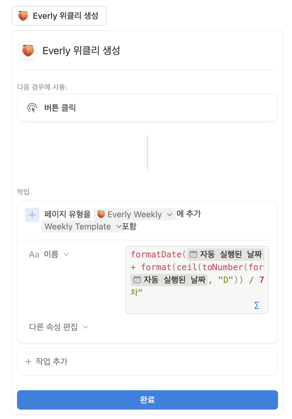 여기서 특정 작업으로는 '페이지 추가 위치' 를 클릭해 처음에 만들었던 [🍑 Everly Weekly] 데이터베이스 내에 페이지가 자동 생성되게 만들었어요.