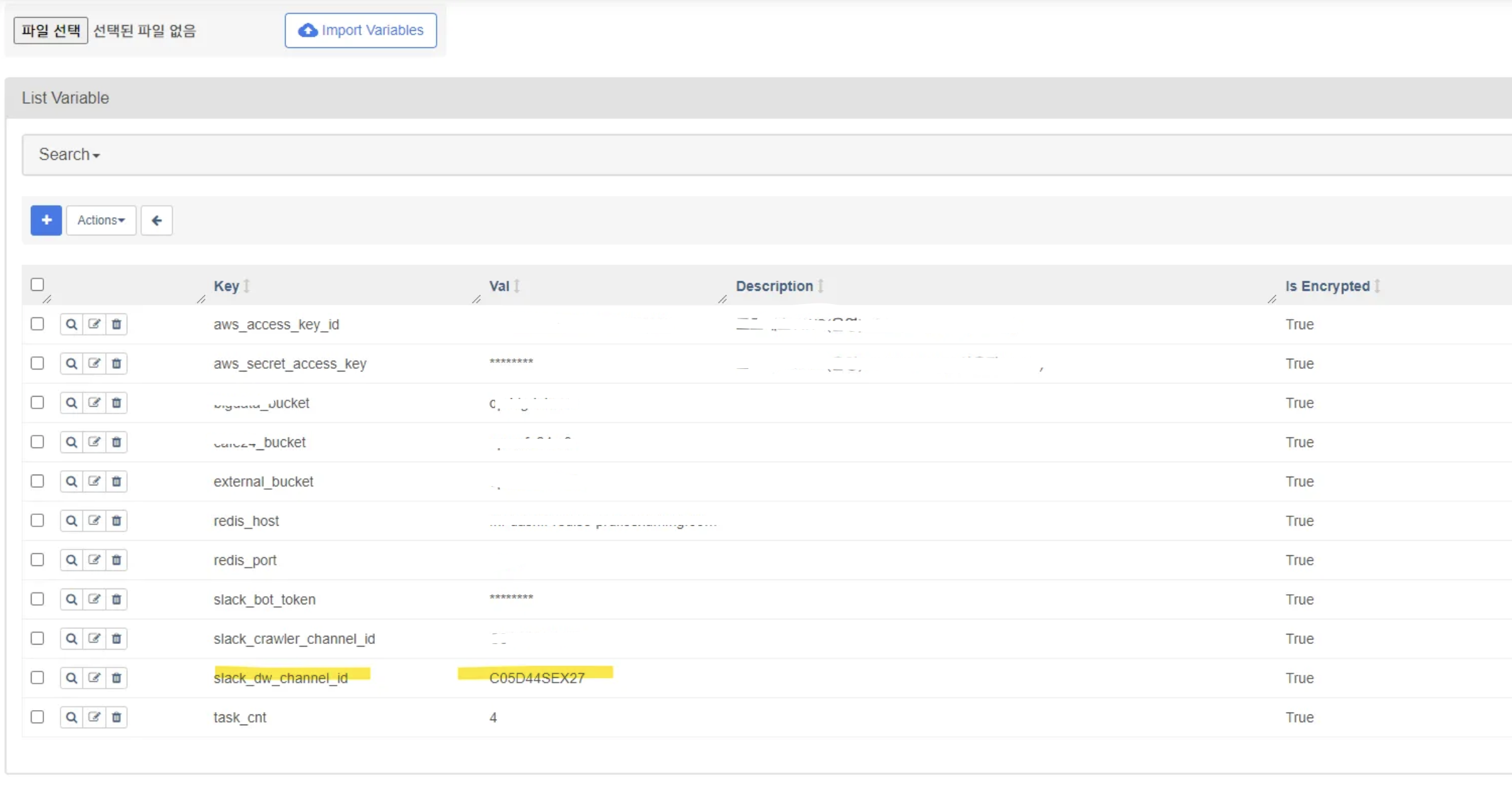 위와 같이 key와 value를 설정해줍니다. key의 경우 앞에서 만든 변수명인 "slack_channel_id"를, value는 가장 처음에 slack에서 복사한 채널id를 기입해줍니다.
