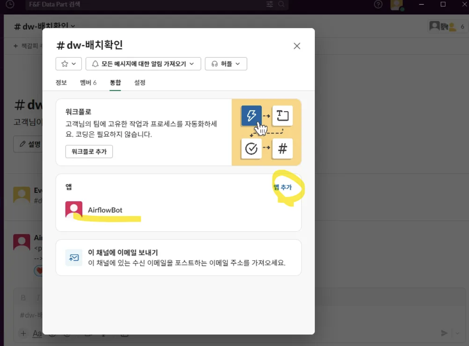 또한 해당 채널에 AirflowBot을 추가해줍니다.