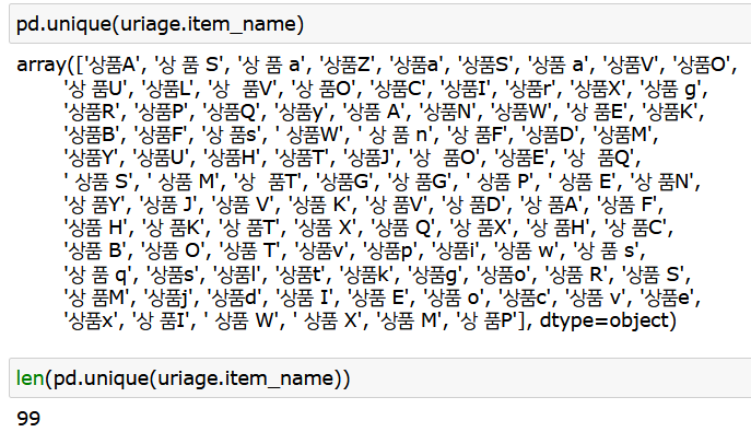 현재 uriage 데이터의 item_name은 오류 때문에 26개여야 하는 상품수가 99개로 나오는 것을 알 수 있다.
