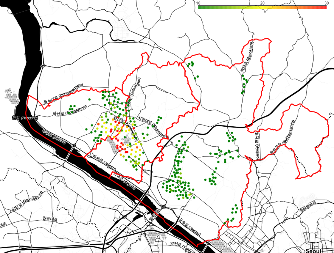 하지만 실수요층을 감안하여 1인 가구 수, 유동인구 수, 지하철역 및 버스정류소 데이터로부터 사람들이 많이 이용할 만한 지역을 추출하였고 GIS 툴을 이용하여 아직 택배함이 설치되지 않았지만 수요자가 많을 곳을 선정해낼 수 있었다.