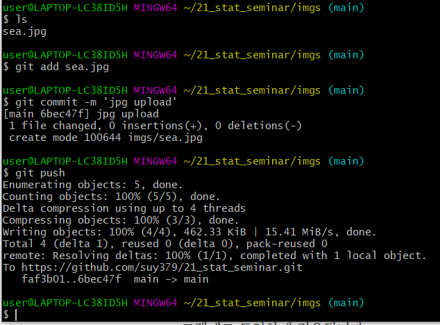 그리고 다시 ls를 출력하면 이제는 'sea.jpg'가 있다고 뜰 것입니다. 여기서 마찬가지로 git add, git commit, git push를 순서대로 진행해주면 깃허브에 업로드가 완료됩니다.