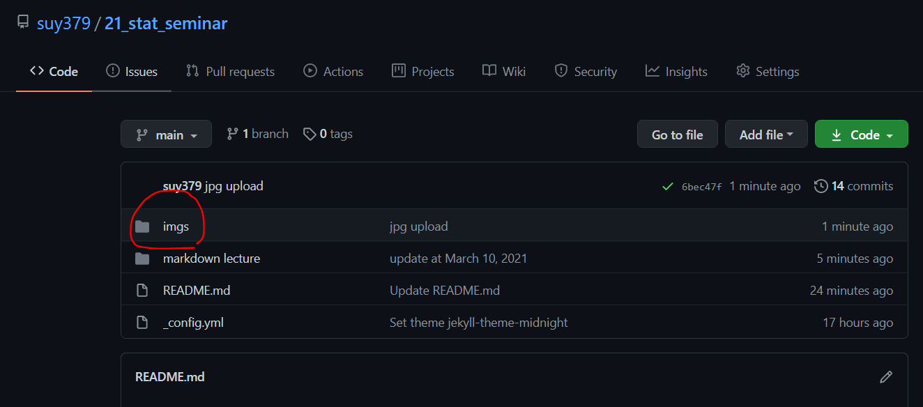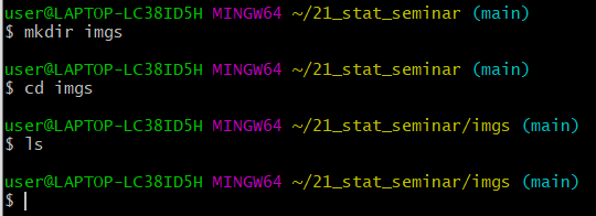 이제 본론으로 넘어가봅시다. 저는 '21_stat_seminar'라는 레파지토리에 'imgs'라는 새로운 폴더를 만든 후 여기에 제가 가진 이미지를 업로드하고자 합니다. 명령어 mkdir는 새로운 디렉토리를 만들며, 저는 'imgs'라는 디렉토리를 만든 후 이동하였습니다. 현재 ls를 출력해보면 빈 폴더이기 때문에 아무것도 출력되지 않습니다.