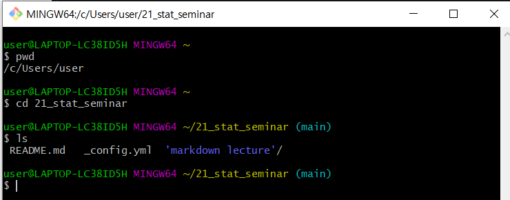 먼저 Git Bash를 실행한 후, Github의 레파지토리가 저장되어 있는 곳으로 경로를 이동합니다. 저의 경우엔 C:\Users\user\21_stat_seminar라는 경로에 저의 레파지토리가 저장되어 있으므로 이동하였습니다.