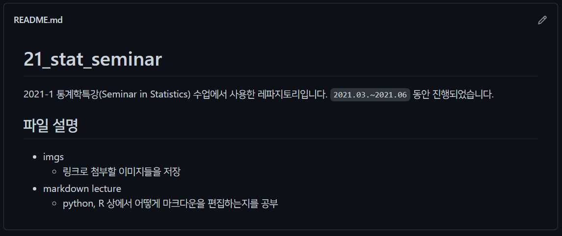 여러분이 깃허브의 레파지토리를 새로 생성하였다면, 기본적으로 해당 레파지토리의 README.md는 레파지토리 이름만 쓰여 있는 형태로 생성됩니다. 이 README 파일은 생성한 레파지토리가 어떤 데이터 or 코드를 담고 있는지를 이 레파지토리를 보는 사람들에게 알려주는 역할을 하기 때문에 알려주려 하는 모든 정보를 담는 것이 중요합니다.