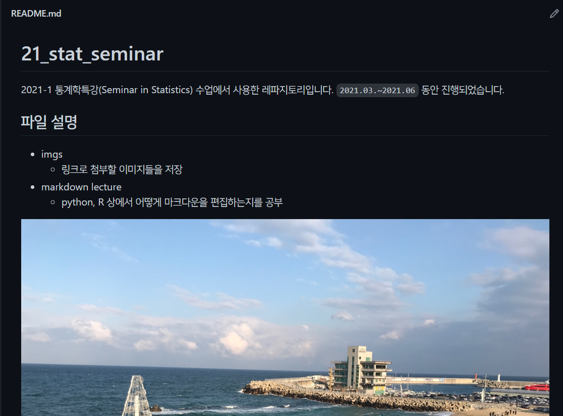 이번에는 README 파일에 이미지를 첨부해 보겠습니다. 이미지의 경우 해당 이미지의 상세 링크가 필요한데, 인터넷상에서 링크 주소가 있는 이미지를 쓸 수도 있으나 저는 제가 갖고 있는 사진을 사용하여 README.md에 추가하도록 하겠습니다.