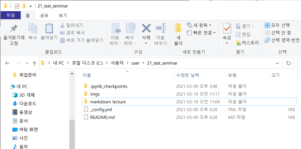 또한 21_stat_seminar 라는 레파지토리는 이미 git clone되어 있어 저는 별다른 작업을 하지 않았지만 아직 컴퓨터상에 레파지토리가 저장되어 있지 않으신 분들은 이를 먼저 하고 오시기 바랍니다. (참고: suy379.tistory.com/2)